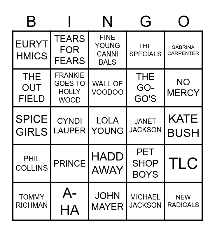 This bingo card has 30 words: A-HA, ANNIE LENNOX, CYNDI LAUPER, DUA LIPA, EURYT HMICS, FINE YOUNG CANNI BALS, FRANKIE GOES TO HOLLY WOOD, HADD AWAY, JANET JACKSON, JOHN MAYER, KATE BUSH, LOLA YOUNG, MICHAEL JACKSON, NEW RADICALS, NO MERCY, NOFX, PET SHOP BOYS, PHIL COLLINS, PRINCE, SABRINA CARPENTER, SPICE GIRLS, TAYLOR DAYNE, TEARS FOR FEARS, THE GO-GO'S, THE OUT FIELD, THE SPECIALS, TLC, TOMMY RICHMAN, WALL OF VOODOO and WHITE TOWN.