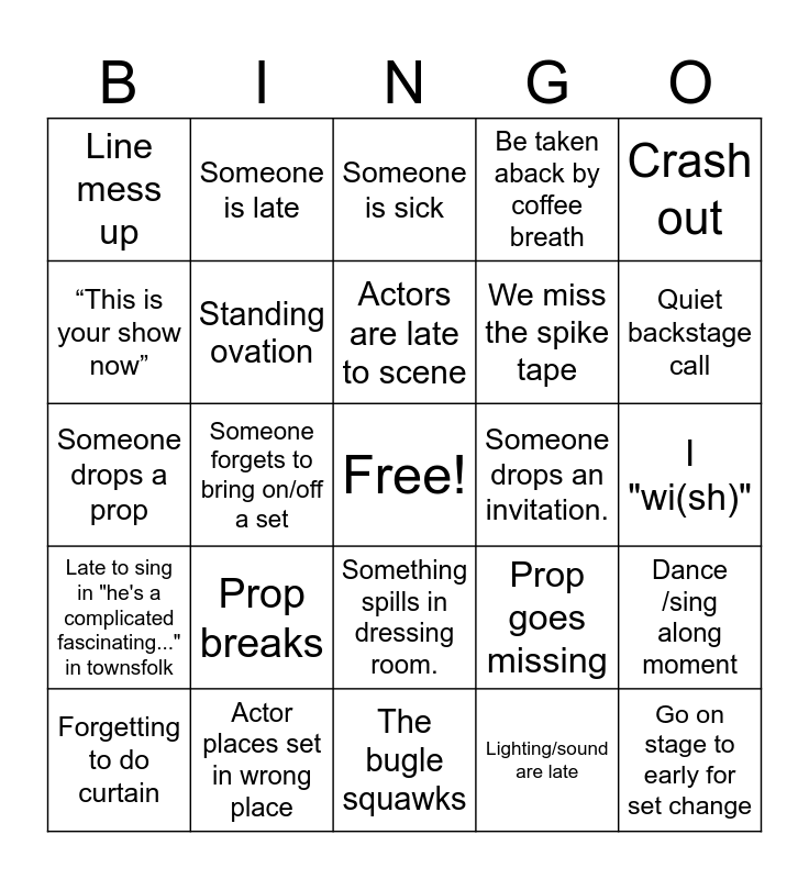 This bingo card has a free space and 24 words: Forgetting to do curtain, Prop breaks, Actors are late to scene, Lighting/sound are late, Crash out, Line mess up, Someone is late, Someone is sick, Someone drops an invitation., I "wi(sh)", Someone drops a prop, Standing ovation, Prop goes missing, Dance /sing along moment, “This is your show now”, Actor places set in wrong place, The bugle squawks, Be taken aback by coffee breath, Quiet backstage call, Late to sing in "he's a complicated fascinating..." in townsfolk, Someone forgets to bring on/off a set, Something spills in dressing room., We miss the spike tape and Go on stage to early for set change.