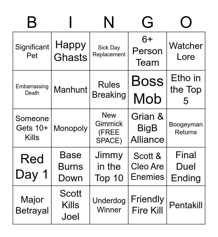 This bingo card has a free space and 24 words: Base Burns Down, Scott Kills Joel, Rules Breaking, Major Betrayal, Watcher Lore, Significant Pet, Embarrassing Death, Happy Ghasts, Grian & BigB Alliance, Jimmy in the Top 10, Boss Mob, Someone Gets 10+ Kills, Scott & Cleo Are Enemies, Final Duel Ending, Manhunt, Friendly Fire Kill, Boogeyman Returns, Sick Day Replacement, Etho in the Top 5, Monopoly, Pentakill, Red Day 1, 6+ Person Team and Underdog Winner.