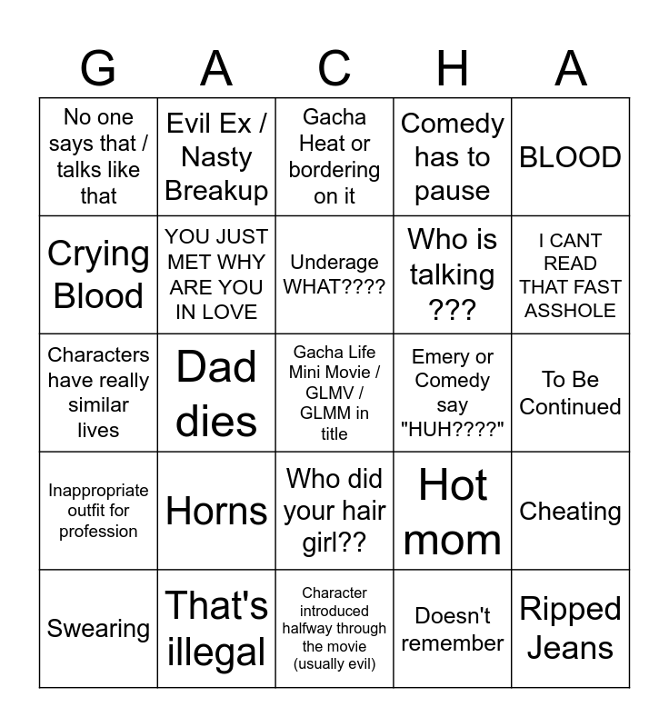 This bingo card has a free space and 133 words: Weirdly placed plants, Bullying, No mention of ages, Face markings (scars, tattoos, ABO stuff etc), Detention, Abbreviation when talking out loud, Inappropriate outfit for profession, Love shape, Heterochromia, No food or drink for the entire video, "..." Speech Bubble, Rooftop scene, Traumadump / random unnatural exposition, Spelling / Grammar Error, DEATH, Gacha Randomized Name, Time skip (1 month+), Shopping scene, KISS, Flashback, Slow walk, That's illegal, Ripped Jeans, Animal People, Comedy or Emery yell, Comedy or Emery shocked, Underage WHAT????, Texting scene with that one app, BLUSH, Closed mouth speech, Who is talking ???, Evil Ex / Nasty Breakup, Cheating, I CANT READ THAT FAST ASSHOLE, No parents, Evil Parents, Gang / Mafia, Emery or Comedy predict next line, Abrupt ending, Music doesn't fit, Comedy has to pause, Emery or Comedy say "WHATTTT?", Fourth Wall Break, Gacha Logic, Gaslighting, RUN AWAY, PARTYYY, No music, Emery or Comedy say "HUH????", BLOOD, Text goes off screen, Character is cut off mid sentence, Random Confession, Love Interest is a Red Flag, Unbearable Character, Twins, Eyepatch or Eye Gauze, Only one parent, Hated Child, Dad dies, Characters have really similar lives, Hospital Scene / Nurses Office, Bandage, Bad Boy, Don't mess with my family, Character with no flaws, Kidnapping, Unexplained Scars (can be undone), Character turns evil in 0.002 seconds, Crying Blood, Sudden Mood Shift, Who did your hair girl??, ABSOLUTELY NO FASHION SENSE, Gay subplot dropped in for 3 lines then never mentioned again, Character dies from something ridiculous, VFX, Character lives despite the fact they should have died, "that has to be against dress code", “Don't touch me… you’ll get hurt.”, Tries to do 2018 trope and then completely fails, WHO GAVE THAT KID A GUN???, Comedy gives a character Mickey Mouse voice, Comedy changes a character's voice a million times, To Be Continued, Emery DOESN'T voice act, Capcut transition, Made with Kinemaster, Why are the wolf and rabbit related, "YOU CAN DO BETTER THAN THAT GIRLLL", Best friend acts like they read the script, YOU JUST MET WHY ARE YOU IN LOVE, text super slow, Living with love interest, Random adoption, Character introduced halfway through the movie (usually evil), Fangs, Lollipop smoking, FIGHT!!!!, Werewolf, Alpha, Toxic relationship, Horns, Gacha Heat or bordering on it, Antagonist only wears black, Unexplained Fantasy Element, Rich kid (and acts like it), Super RICH, Terrible Insult, TikTok type Comeback, Watermark, Censoring random words, Swearing, Car accident, Doesn't remember, Couple that looks like siblings, Kids look like child versions of their parents with no changes, Family issues, No one says that / talks like that, Character speaks like they ate a thesaurus, Hot mom, Insane coincidence, Blackmail, Crying, Face shadow, Medically inaccurate, Cartoonishly Evil, Government Involvement, Car chase, Betrayal, Plot twist, Comedy or Emery predict plot twist, Doesn't learn lesson and HOW DO YOU REMEMBER THAT???.