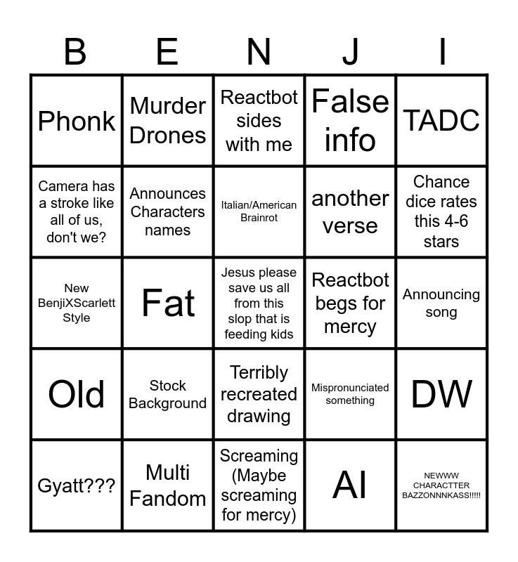 This bingo card has a free space and 32 words: AI, Stolen, Fat, Sprunki, Old, Announces Characters names, TADC, DW, Murder Drones, Labubu, Italian/American Brainrot, Reactbot sides with me, I predict right, Reactbot sides with vid, Reactbot begs for mercy, Misread captions, Gyatt???, New BenjiXScarlett Style, Terribly recreated drawing, Stock Background, Mispronunciated something, Benji Hops on the mic, Announcing song, Multi Fandom, NEWWW CHARACTTER BAZZONNNKASS!!!!!, False info, another verse, Camera has a stroke like all of us, don't we?, Phonk, Screaming (Maybe screaming for mercy), Chance dice rates this 1-3 stars and Chance dice rates this 4-6 stars.