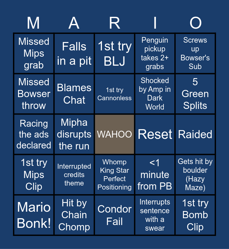 This bingo card has a free space and 32 words: Interrupts sentence with a swear, Masae says "Quiet time Focus Time", Mipha disrupts the run, Split Skipped, 1st try Mips Clip, Blames Chat, Screws up Bowser's Sub, Gets hit by boulder (Hazy Maze), Falls in a pit, Lakitu Skip fail, 1st try Cannonless, 1st try BLJ, Killed a Goomba, Stress singing, Reset, Quicksand death, Mario Bonk!, Racing the ads declared, Whomp King Star Perfect Positioning, Interrupted credits theme, <1 minute from PB, Brett Cameo, Raided, Hit by Chain Chomp, 1st try Bomb Clip, Penguin pickup takes 2+ grabs, Shocked by Amp in Dark World, Missed Bowser throw, Missed Mips grab, Condor Fail, Late to Fire sea Elevator and 5 Green Splits.