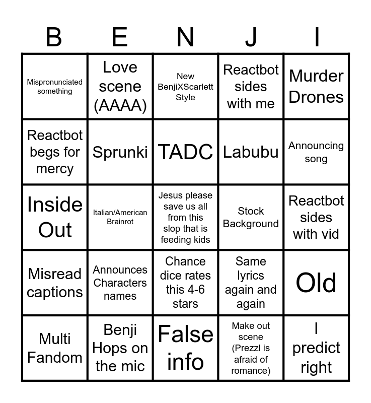 This bingo card has a free space and 38 words: AI, Stolen, Fat, Sprunki, Old, Announces Characters names, TADC, DW, Murder Drones, Labubu, Italian/American Brainrot, Reactbot sides with me, I predict right, Reactbot sides with vid, Reactbot begs for mercy, Misread captions, Gyatt???, New BenjiXScarlett Style, Terribly recreated drawing, Stock Background, Mispronunciated something, Benji Hops on the mic, Announcing song, Multi Fandom, NEWWW CHARACTTER BAZZONNNKASS!!!!!, False info, another verse, Camera has a stroke like all of us, don't we?, Phonk, Screaming (Maybe screaming for mercy), Chance dice rates this 1-3 stars, Chance dice rates this 4-6 stars, Make out scene (Prezzl is afraid of romance), Love scene (AAAA), ___? Yes___? I don't think i can survive ___ alone. Me neither, its just so scary, Same lyrics again and again, Inside Out and Animations are awful.