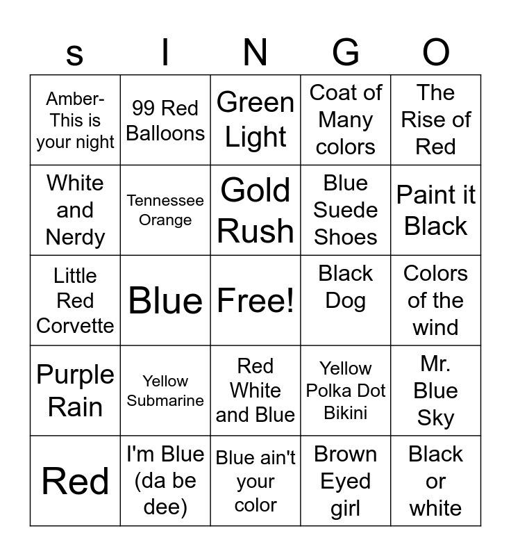 This bingo card has a free space and 24 words: Yellow Submarine, I'm Blue (da be dee), Gold Rush, Red, The Rise of Red, Amber-This is your night, White and Nerdy, 99 Red Balloons, Black Dog, Red White and Blue, Blue Suede Shoes, Little Red Corvette, Yellow Polka Dot Bikini, Mr. Blue Sky, Tennessee Orange, Brown Eyed girl, Colors of the wind, Green Light, Paint it Black, Blue, Black or white, Purple Rain, Coat of Many colors and Blue ain't your color.