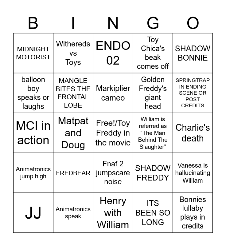 This bingo card has a free space and 26 words: Fnaf 2 jumpscare noise, ITS BEEN SO LONG, Markiplier cameo, Animatronics speak, SHADOW BONNIE, MIDNIGHT MOTORIST, balloon boy speaks or laughs, Withereds vs Toys, Charlie's death, SHADOW FREDDY, Golden Freddy's giant head, MCI in action, Vanessa is hallucinating William, JJ, Matpat and Doug, Puppet controls the toys, Toy Chica's beak comes off, Animatronics jump high, ENDO 02, Bonnies lullaby plays in credits, SPRINGTRAP IN ENDING SCENE OR POST CREDITS, Henry with William, William is referred as "The Man Behind The Slaughter", FREDBEAR, MANGLE BITES THE FRONTAL LOBE and Mike or someone uses a mask.