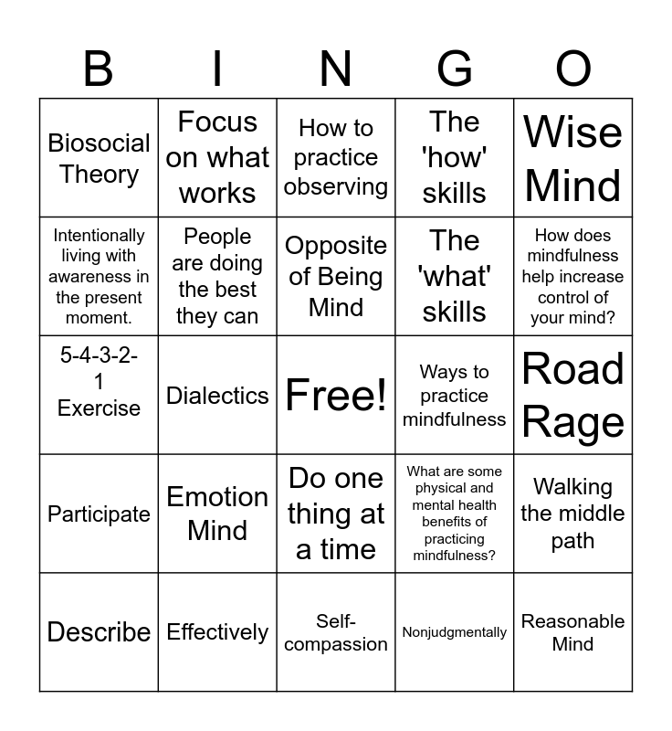 This bingo card has a free space and 24 words: Emotion Mind, Effectively, Opposite of Being Mind, Describe, Wise Mind, Biosocial Theory, Intentionally living with awareness in the present moment., Focus on what works, Ways to practice mindfulness, Do one thing at a time, The 'what' skills, 5-4-3-2-1 Exercise, What are some physical and mental health benefits of practicing mindfulness?, Walking the middle path, People are doing the best they can, Nonjudgmentally, Road Rage, How to practice observing, How does mindfulness help increase control of your mind?, Dialectics, Reasonable Mind, Participate, The 'how' skills and Self-compassion.