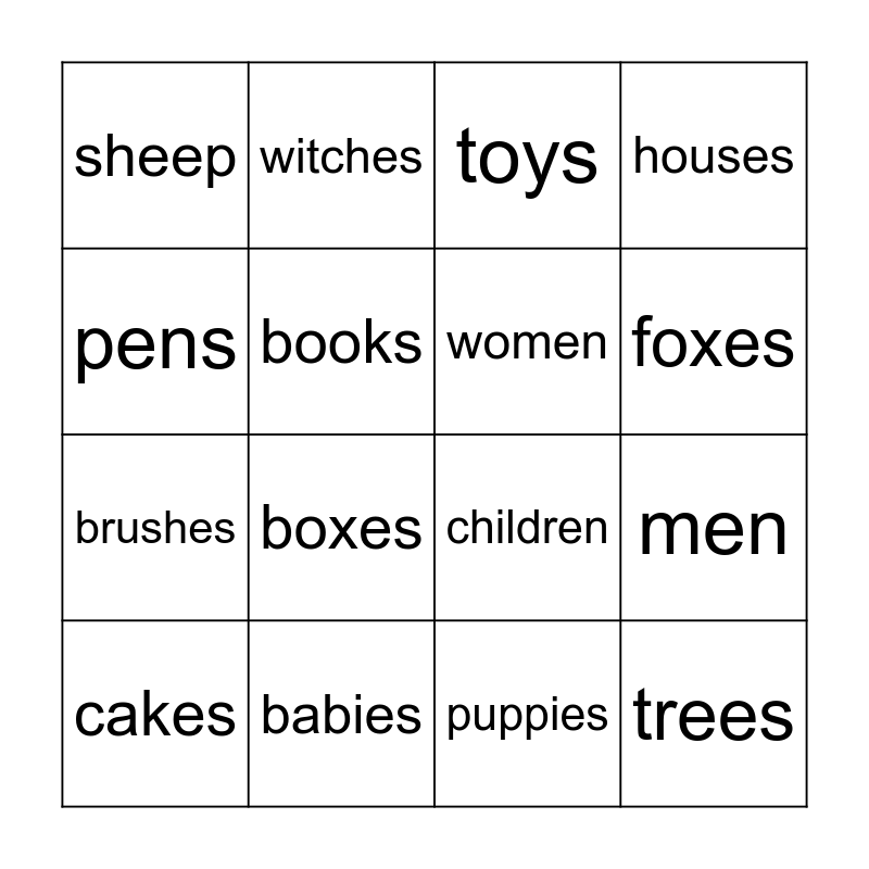 This bingo card has 23 words: trees, cars, foxes, deer, pens, sheep, books, witches, cakes, girls, boxes, brushes, buses, parties, babies, wolves, toys, children, women, men, houses, puppies and families.