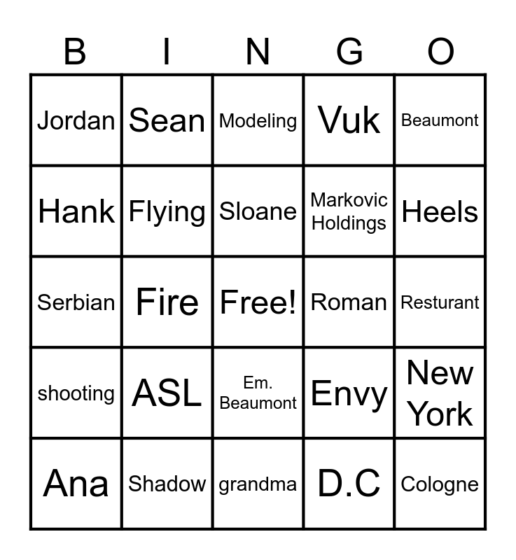 This bingo card has a free space and 24 words: ASL, Shadow, Sloane, Ana, Beaumont, Jordan, Hank, Sean, Roman, Em. Beaumont, Markovic Holdings, Serbian, Envy, New York, Flying, D.C, Resturant, Modeling, Heels, Fire, Cologne, shooting, Vuk and grandma.