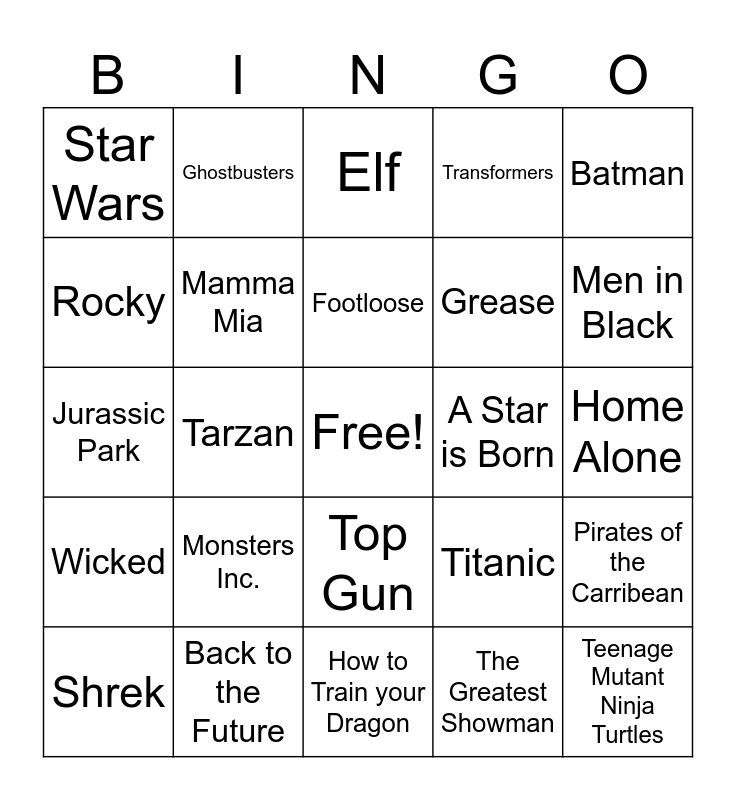 This bingo card has a free space and 24 words: Monsters Inc., Back to the Future, Footloose, Shrek, Batman, Star Wars, Rocky, Ghostbusters, A Star is Born, Top Gun, Grease, Jurassic Park, Titanic, Pirates of the Carribean, Mamma Mia, The Greatest Showman, Home Alone, Elf, Men in Black, Tarzan, Teenage Mutant Ninja Turtles, Wicked, Transformers and How to Train your Dragon.