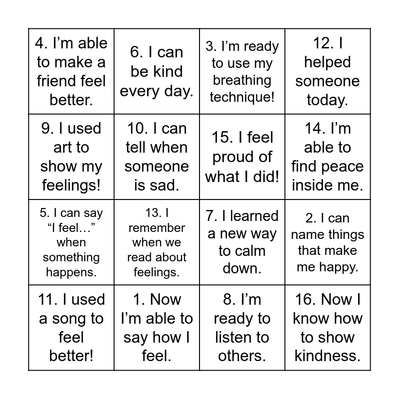 This bingo card has 16 words: 1. Now I’m able to say how I feel., 2. I can name things that make me happy., 3. I’m ready to use my breathing technique!, 4. I’m able to make a friend feel better., 5. I can say “I feel…” when something happens., 6. I can be kind every day., 7. I learned a new way to calm down., 8. I’m ready to listen to others., 9. I used art to show my feelings!, 10. I can tell when someone is sad., 11. I used a song to feel better!, 12. I helped someone today., 13. I remember when we read about feelings., 14. I’m able to find peace inside me., 15. I feel proud of what I did! and 16. Now I know how to show kindness..