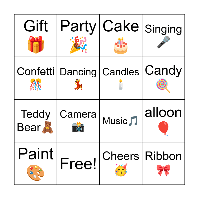 This bingo card has 16 words: Free!, alloon🎈, Cake🎂, Gift🎁, Teddy Bear🧸, Party🎉, Music🎵, Cheers🥳, Confetti🎊, Dancing💃, Paint🎨, Singing🎤, Camera📸, Candy🍭, Candles🕯️ and Ribbon🎀.