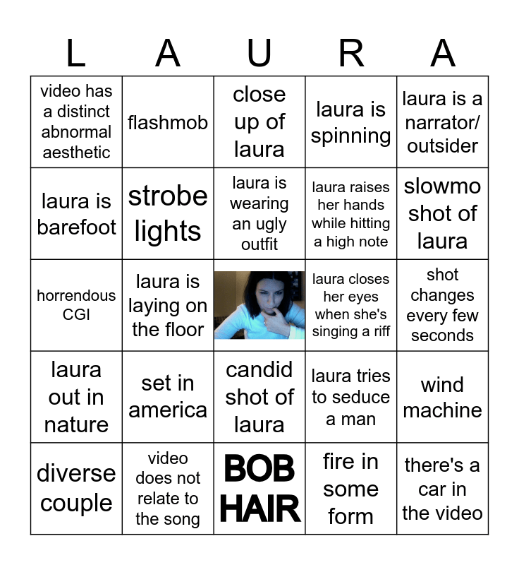 This bingo card has a free space and 24 words: diverse couple, set in america, laura is wearing an ugly outfit, fire in some form, laura is a narrator/ outsider, video has a distinct abnormal aesthetic, flashmob, close up of laura, laura closes her eyes when she's singing a riff, shot changes every few seconds, horrendous CGI, strobe lights, laura tries to seduce a man, wind machine, laura is barefoot, video does not relate to the song, BOB HAIR, laura is spinning, slowmo shot of laura, laura out in nature, laura is laying on the floor, candid shot of laura, laura raises her hands while hitting a high note and there's a car in the video.