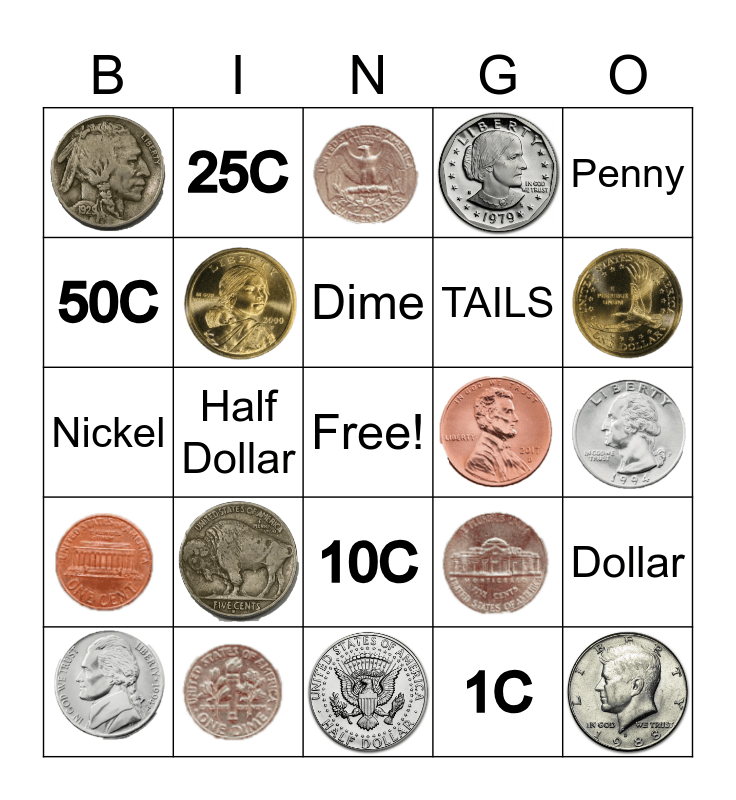 This bingo card has 20 images, a free space and 14 words: 1C, Quarter, Penny, 25C, Dime, 5C, Nickel, 10C, HEADS, TAILS, 50C, $1, Half Dollar and Dollar.