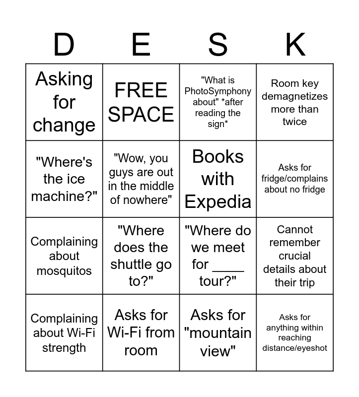 This bingo card has 16 words: Asks for Wi-Fi from room, Cannot remember crucial details about their trip, "What is PhotoSymphony about" *after reading the sign*, Asking for change, Complaining about mosquitos, FREE SPACE, "Where do we meet for ____ tour?", Asks for "mountain view", "Where's the ice machine?", "Wow, you guys are out in the middle of nowhere", Complaining about Wi-Fi strength, Room key demagnetizes more than twice, "Where does the shuttle go to?", Asks for fridge/complains about no fridge, Books with Expedia and Asks for anything within reaching distance/eyeshot.