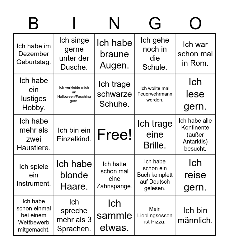 This bingo card has a free space and 41 words: Ich mache eine Ballsportart., Ich habe mehr als zwei Haustiere., Ich hasse Süßigkeiten., Ich verkleide mich an Halloween/Fasching gern., Ich spreche mehr als 3 Sprachen., Ich hatte schon mal eine Zahnspange., Ich trage schwarze Schuhe., Ich fotografiere gerne., Ich war schon mal in Rom., Ich spiele ein Instrument., Ich bin ein Einzelkind., Ich gehe noch in die Schule., Ich bin männlich., Ich habe alle Kontinente (außer Antarktis) besucht., Ich trage eine Brille., Ich habe blonde Haare., Ich tanze gern., Ich habe im Dezember Geburtstag., Mein Sternzeichen ist Schütze., Ich habe braune Augen., Ich reise gern., Ich habe schon ein Fußballspiel im Stadion erlebt., Ich sammle etwas., Ich wollte mal Feuerwehrmann werden., Ich habe eine Allergie., Ich trage eine Uhr., Mein Lieblingsessen ist Pizza., Ich kann einen Handstand machen., Ich lese gern., Ich habe zwei Geschwister., Ich esse gerne Kekse., Ich singe gerne unter der Dusche., Ich habe schon einmal bei einem Wettbewerb mitgemacht., Ich war schon mal im Ausland ohne meine Familie., Ich habe schon ein Buch komplett auf Deutsch gelesen., Ich habe ein lustiges Hobby., Ich kann ein Gericht aus einem anderen Land kochen., Ich bin schon einmal mit dem Zug über 6 Stunden gefahren., Ich habe einen Lieblingsfilm, den ich mehr als 5 Mal gesehen habe., Ich bin schon mal auf einem Konzert gewesen. and Ich habe schon eine andere Haarfarbe ausprobiert..