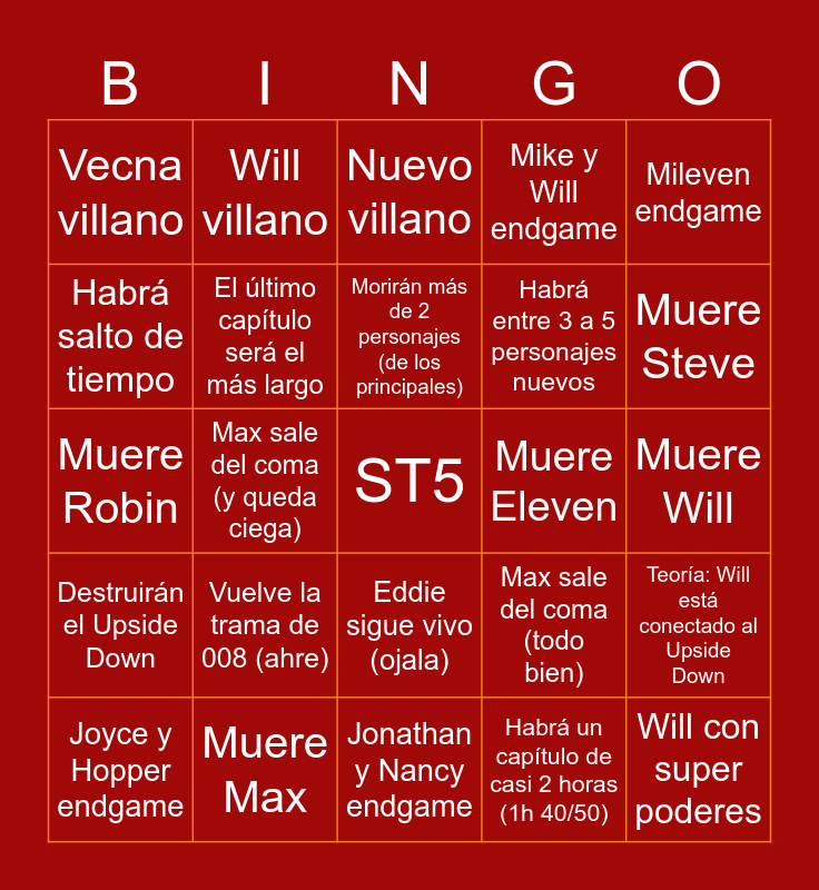 This bingo card has a free space and 24 words: Vuelve la trama de 008 (ahre), Muere Max, Morirán más de 2 personajes (de los principales), Joyce y Hopper endgame, Mileven endgame, Vecna villano, Habrá salto de tiempo, Will villano, Muere Eleven, Eddie sigue vivo (ojala), Habrá entre 3 a 5 personajes nuevos, Muere Robin, Max sale del coma (todo bien), Teoría: Will está conectado al Upside Down, El último capítulo será el más largo, Habrá un capítulo de casi 2 horas (1h 40/50), Muere Will, Nuevo villano, Muere Steve, Max sale del coma (y queda ciega), Will con super poderes, Destruirán el Upside Down, Mike y Will endgame and Jonathan y Nancy endgame.