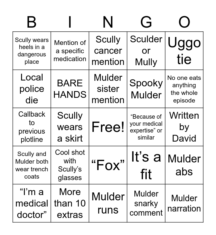 This bingo card has a free space and 78 words: “You’re too close to this”, Laugh out loud, Scully cancer mention, Ad goes over, Dupixent ad, Scully cross necklace, We fill in the next line of dialogue or scene, Disgustingly graphic, Lone Gunman appearance, Not a parking spot, “I have to know”, Mulder sleeps on his couch, Sculder or Mully, Scully wears heels in a dangerous place, Mulder clearly not listening, Local police die, Continuous shot, Cool shot with Scully’s glasses, Waste of taxpayer money, Written by David, Music by Mark Snow, Uggo tie, Callback to previous plotline, Mulder sister mention, BARE HANDS, Answering the phone with “it’s me”, Skinner tells Mulder to back off, Bill Clinton photo, Scully does the autopsy, Monster put in regular jail, No one eats anything the whole episode, Everything is worse than when the episode starts, Mulder runs, Mulder runs through the woods, “I’m a medical doctor”, “Because of your medical expertise” or similar, Scully or Mulder shoot each other, Scully or Mulder apartment broken into, Scully narration, Mulder narration, “Do you trust me”, Scully and/or Mulder sent to hospital, Scully and/or Mulder visit hospital, Jacqueline cry laughing, Pendrell ‼️‼️‼️, Mention of a specific medication, Mulder and Scully split up (WHY!!!), Referral, Time stamp, Mulder explains plot & no one believes him, Mulder abs, Scully wears a skirt, It’s a fit, To be continued, Photo edited beyond what is possible to find perpetrator, Super chill reaction to something horrifying, Scully is the believer, Aliens, Cigarette Man appearance, “Fox”, Spooky Mulder, “Dana”, “I’m a federal agent!!!”, “I have X number of X Files on this”, Skinner in episode, Agent Mulder, Agent Scully, Military-related episode, Scully and Mulder both wear trench coats, More than 10 extras, Episodes begins with the end, Scully abduction mention, Scene in Scully’s apartment, Scene in Mulder’s apartment, Mulder snarky comment, Mulder or Scully go on a date!, Written by Chris Carter and I Need a True Love ❤️.