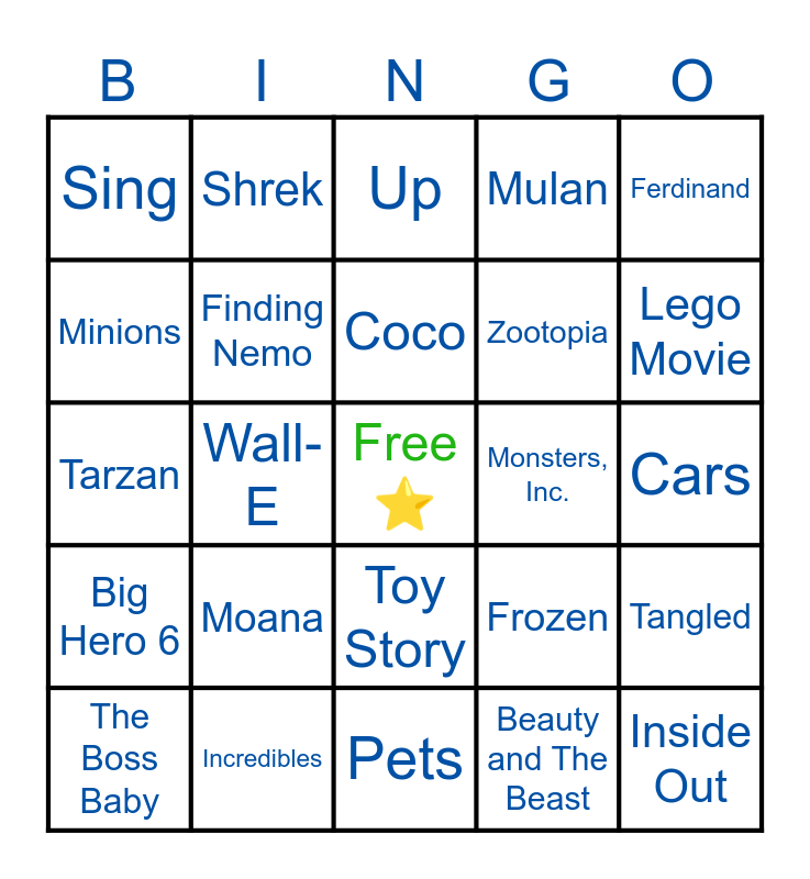 This bingo card has a free space and 24 words: Moana, Incredibles, Coco, The Boss Baby, Ferdinand, Sing, Minions, Shrek, Monsters, Inc., Toy Story, Zootopia, Tarzan, Frozen, Tangled, Finding Nemo, Beauty and The Beast, Cars, Up, Lego Movie, Wall- E, Inside Out, Big Hero 6, Mulan and Pets.