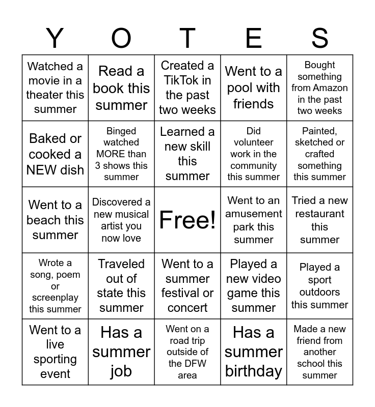 This bingo card has a free space and 24 words: Traveled out of state this summer, Has a summer job, Learned a new skill this summer, Went to a live sporting event, Bought something from Amazon in the past two weeks, Watched a movie in a theater this summer, Baked or cooked a NEW dish, Read a book this summer, Went to an amusement park this summer, Went to a summer festival or concert, Did volunteer work in the community this summer, Went to a beach this summer, Played a new video game this summer, Played a sport outdoors this summer, Binged watched MORE than 3 shows this summer, Has a summer birthday, Tried a new restaurant this summer, Created a TikTok in the past two weeks, Painted, sketched or crafted something this summer, Discovered a new musical artist you now love, Made a new friend from another school this summer, Wrote a song, poem or screenplay this summer, Went to a pool with friends and Went on a road trip outside of the DFW area.