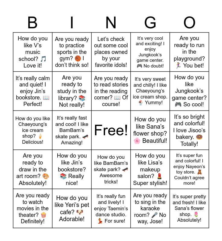 This bingo card has a free space and 34 words: Are you ready to dance in the music room? 🎶 Sure thing!, Are you ready to sing in the karaoke room? 🎤 No way, Jose!, Are you ready to play games in the PC room? 🎮 Maybe!, Are you ready to eat snacks in the cafeteria? 🍪 I guess so!, Are you ready to draw in the art room? 🎨 Absolutely!, Are you ready to study in the library? 📚 Not really!, Are you ready to run in the playground? 🏃♀️ You bet!, Are you ready to watch movies in the theater? 🍿 Definitely!, Are you ready to practice sports in the gym? 🏀 I don’t think so!, Are you ready to relax in the lounge? 🛋️ Sounds good!, Are you ready to read stories in the reading corner? 📖 Of course!, Let’s check out some cool places owned by your favorite idols!, How do you like Jisoo’s bakery? 🍰 It’s awesome!, How do you like Taemin’s dance studio? 💃 Totally amazing!, How do you like Sana’s flower shop? 🌸 Beautiful!, How do you like Jungkook’s game center? 🎮 So cool!, How do you like Yeri’s pet cafe? 🐶 Adorable!, How do you like Chaeyoung’s ice cream shop? 🍦 Delicious!, How do you like Jin’s bookstore? 📚 Really nice!, How do you like Lisa’s makeup salon? 💄 Super stylish!, How do you like BamBam’s skate park? 🛹 Awesome tricks!, How do you like Nayeon’s toy store? 🧸 So fun!, How do you like V’s music school? 🎵 Love it!, It’s so bright and colorful! I love Jisoo’s bakery. 🍩 Totally!, It’s really fun and lively! I enjoy Taemin’s dance studio. 💃 For sure!, It’s super pretty and fresh! I like Sana’s flower shop. 🌷 Absolutely!, It’s very cool and exciting! I enjoy Jungkook’s game center. 🎮 No doubt!, It’s very cozy and cute! I love Yeri’s pet cafe. 🐕 Definitely!, It’s very sweet and chilly! I like Chaeyoung’s ice cream shop. 🍨 Yummy!, It’s really calm and quiet! I enjoy Jin’s bookstore. 📖 Perfect!, It’s very stylish and bright! I love Lisa’s makeup salon. 💅 So chic!, It’s really fast and cool! I like BamBam’s skate park. 🛹 Amazing!, It’s super fun and colorful! I enjoy Nayeon’s toy store. 🧸 Couldn’t agree more! and It’s so loud and happy! I love V’s music school. 🎶 Love it too!.