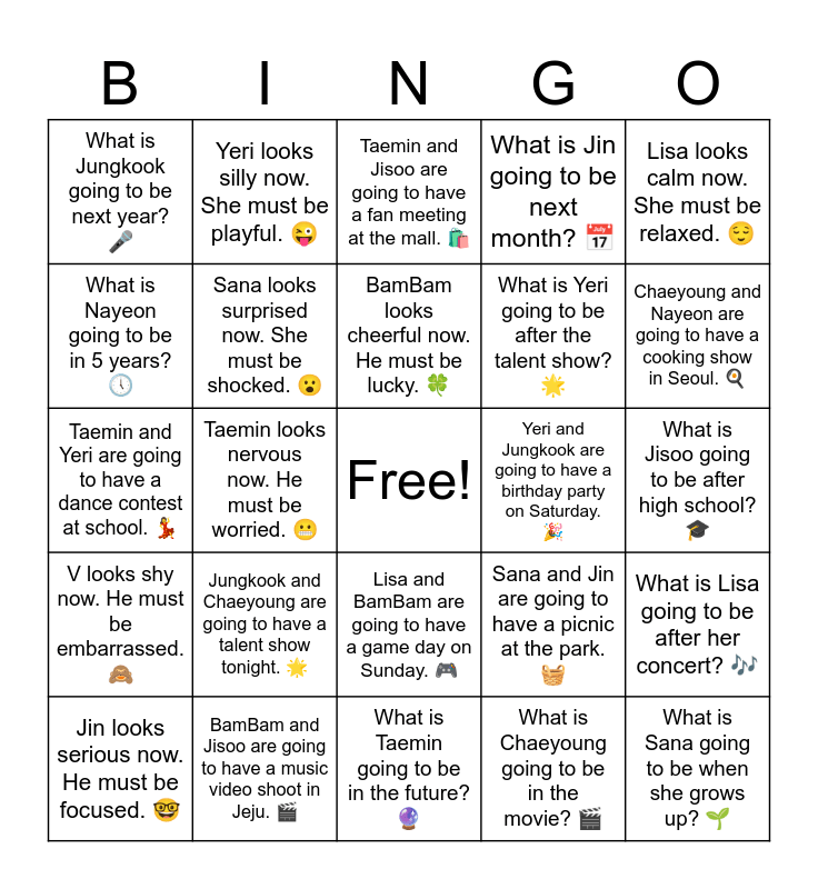 This bingo card has a free space and 33 words: Jungkook looks tired now. He must be sleepy. ๐ด, Jisoo looks excited now. She must be happy. ๐, Taemin looks nervous now. He must be worried. ๐ฌ, Nayeon looks proud now. She must be confident. ๐โโ๏ธ, V looks shy now. He must be embarrassed. ๐, Sana looks surprised now. She must be shocked. ๐ฎ, Lisa looks calm now. She must be relaxed. ๐, Jin looks serious now. He must be focused. ๐ค, Yeri looks silly now. She must be playful. ๐, Chaeyoung looks cold now. She must be freezing. ๐ฅถ, BamBam looks cheerful now. He must be lucky. ๐, Taemin and Jisoo are going to have a fan meeting at the mall. ๐๏ธ, Lisa and V are going to have a concert in Busan. ๐ค, Jin and Sana are going to have a photo shoot at the beach. ๐ธ, Yeri and Jungkook are going to have a birthday party on Saturday. ๐, Chaeyoung and Nayeon are going to have a cooking show in Seoul. ๐ณ, BamBam and Jisoo are going to have a music video shoot in Jeju. ๐ฌ, Taemin and Yeri are going to have a dance contest at school. ๐, Jungkook and Chaeyoung are going to have a talent show tonight. ๐, Sana and Jin are going to have a picnic at the park. ๐งบ, Lisa and BamBam are going to have a game day on Sunday. ๐ฎ, Nayeon and V are going to have a radio show in the morning. ๐ป, What is Jungkook going to be next year? ๐ค, What is Jisoo going to be after high school? ๐, What is Taemin going to be in the future? ๐ฎ, What is Sana going to be when she grows up? ๐ฑ, What is Jin going to be next month? ๐ , What is Yeri going to be after the talent show? ๐, What is Nayeon going to be in 5 years? ๐, What is Lisa going to be after her concert? ๐ถ, What is V going to be next summer? โ๏ธ, What is Chaeyoung going to be in the movie? ๐ฌ and What is BamBam going to be on TV tomorrow? ๐บ.