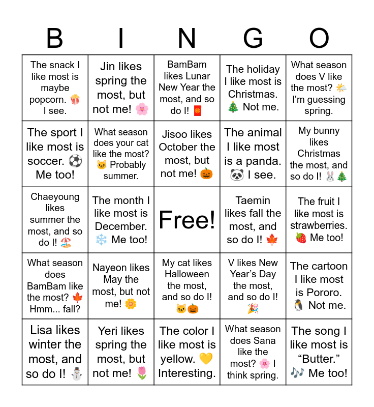 This bingo card has a free space and 34 words: What season does Jungkook like the most? โ๏ธ Maybe winter., What season does Sana like the most? ๐ธ I think spring., What season does your hamster like the most? ๐น No idea!, What season does Jisoo like the most? โ๏ธ Maybe summer., What season does BamBam like the most? ๐ Hmm... fall?, What season does your cat like the most? ๐ฑ Probably summer., What season does V like the most? ๐ค๏ธ I'm guessing spring., Lisa likes winter the most, and so do I! โ, Jin likes spring the most, but not me! ๐ธ, My puppy likes summer the most, and so do I! ๐ถ๐, Jisoo likes October the most, but not me! ๐, BamBam likes Lunar New Year the most, and so do I! ๐งง, Sana likes Chuseok the most, and so do I! ๐, Jungkook likes July the most, but not me! โ๏ธ, Taemin likes fall the most, and so do I! ๐, My bunny likes Christmas the most, and so do I! ๐ฐ๐, Yeri likes spring the most, but not me! ๐ท, Chaeyoung likes summer the most, and so do I! ๐๏ธ, Nayeon likes May the most, but not me! ๐ผ, V likes New Yearโs Day the most, and so do I! ๐, My cat likes Halloween the most, and so do I! ๐ฑ๐, The game I like most is Roblox. ๐ฎ Me too!, The snack I like most is maybe popcorn. ๐ฟ I see., The fruit I like most is strawberries. ๐ Me too!, The color I like most is yellow. ๐ Interesting., The song I like most is โButter.โ ๐ถ Me too!, The holiday I like most is Christmas. ๐ Not me., The K-pop idol I like most is Lisa. ๐ Me too!, The animal I like most is a panda. ๐ผ I see., The sport I like most is soccer. โฝ Me too!, The drink I like most is banana milk. ๐ฅ๐ Interesting., The month I like most is December. โ๏ธ Me too!, The cartoon I like most is Pororo. ๐ง Not me. and The dessert I like most is chocolate cake. ๐ฐ Me too!.