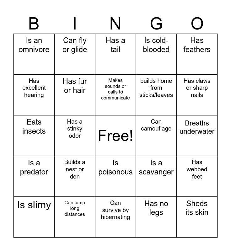This bingo card has a free space and 34 words: Can photo-synthesize, Has no legs, Lives in the water, Is an herbivore, Is a predator, Has fur or hair, Has feathers, Is slimy, Can fly or glide, Has a shell, Makes sounds or calls to communicate, Has a tail, Is nocturnal, Lays eggs, Can camouflage, Has claws or sharp nails, Can jump long distances, Eats insects, Builds a nest or den, Is a scavanger, Is poisonous, Has scales, Is an omnivore, Breaths underwater, Can survive by hibernating, Sheds its skin, Is cold-blooded, Is warm-blooded, builds home from sticks/leaves, Has excellent hearing, Found in a wetland, Has a stinky odor, Has webbed feet and went from water to land.