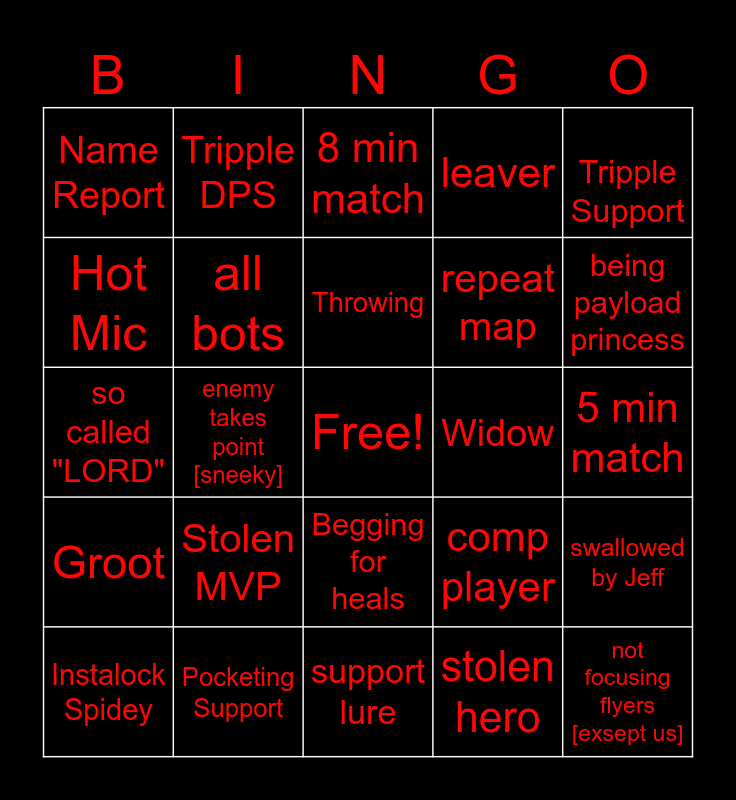 This bingo card has a free space and 24 words: Stolen MVP, Pocketing Support, Throwing, Instalock Spidey, Tripple Support, Name Report, Hot Mic, Tripple DPS, Widow, Begging for heals, repeat map, so called "LORD", comp player, swallowed by Jeff, all bots, stolen hero, 5 min match, 8 min match, being payload princess, enemy takes point [sneeky], not focusing flyers [exsept us], Groot, leaver and support lure.
