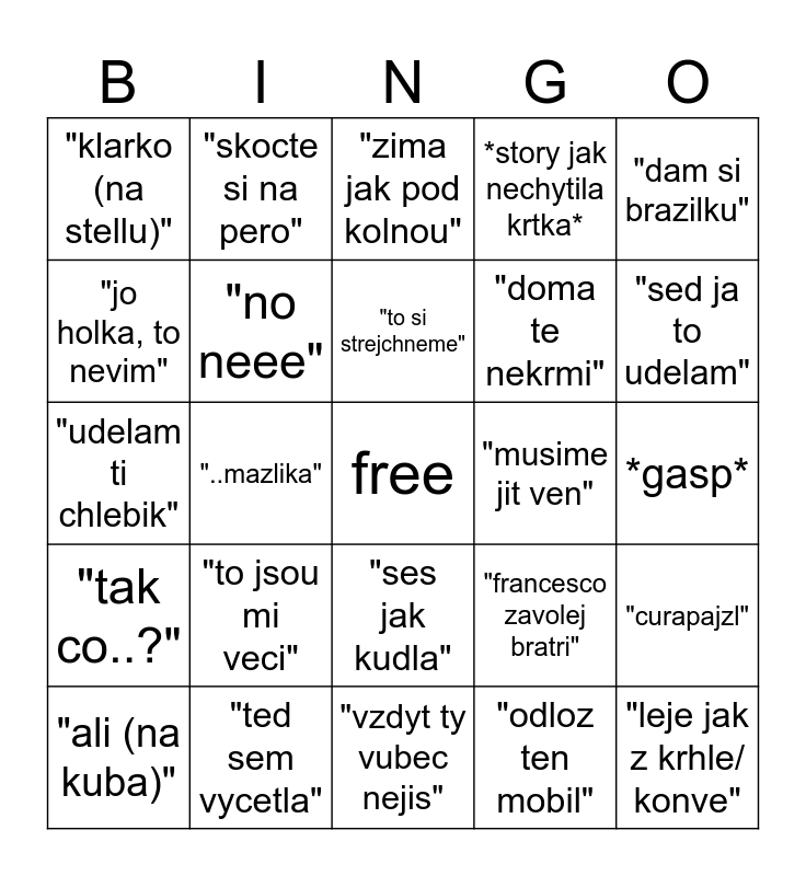 This bingo card has a free space and 24 words: "to jsou mi veci", "ted sem vycetla", "to si strejchneme", "ali (na kuba)", "dam si brazilku", "klarko (na stellu)", "jo holka, to nevim", "skocte si na pero", "musime jit ven", "ses jak kudla", "doma te nekrmi", "udelam ti chlebik", "francesco zavolej bratri", "curapajzl", "no neee", "odloz ten mobil", *gasp*, "zima jak pod kolnou", "sed ja to udelam", "..mazlika", "leje jak z krhle/ konve", "tak co..?", *story jak nechytila krtka* and "vzdyt ty vubec nejis".