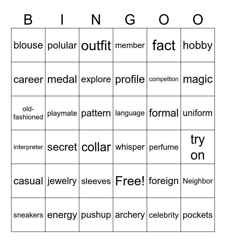 This bingo card has 36 words: Free!, sleeves, archery, career, interpreter, language, medal, pushup, fact, foreign, magic, member, Neighbor, playmate, profile, blouse, casual, formal, old-fashioned, outfit, pattern, secret, whisper, collar, perfume, polular, compettion, energy, explore, hobby, pockets, sneakers, try on, uniform, jewelry and celebrity.