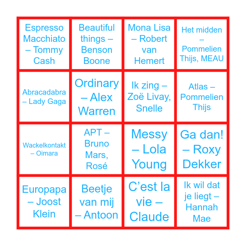 This bingo card has 30 words: Echte liefde is te koop – Samuel Welten, Goud – Suzan en Freek, Ga dan! – Roxy Dekker, Lotje- Jopke, Roeland, Espresso Macchiato – Tommy Cash, Mona Lisa – Robert van Hemert, Ik zing – Zoë Livay, Snelle, De overkant – Suzan en Freek, Beetje van mij – Antoon, Entourage – Bankzitters, C’est la vie – Claude, Europapa – Joost Klein, Ik haat hem voor jou – Froukje, S10, Alles op gevoel – Flemming, APT – Bruno Mars, Rosé, Stukje van mij – MEAU, Terug in de tijd – Yves Berendse, Ik wil dat je liegt – Hannah Mae, Azizam – Ed Sheeran, Abracadabra – Lady Gaga, Messy – Lola Young, Liefste – Luna, Beautiful things – Benson Boone, Wackelkontakt – Oimara, Ordinary – Alex Warren, Het midden – Pommelien Thijs, MEAU, Huisfeestje – Bankzitters, Roxy Dekker, Die with a smile – Bruno Mars, Lady Gaga, Atlas – Pommelien Thijs and Baila de gasolina – Effe serieus.