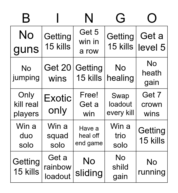 This bingo card has a free space and 29 words: Getting 15 kills, Mythic only, Exotic only, No weapons, No guns, Get 5 win in a row, Get 20 wins, Win a squad solo, Swap loadout every kill, Get a rainbow loadout, Get 7 crown wins, No running, No sliding, No shild gain, No heath gain, Only move when running, Have a heal off end game, Win a duo solo, Get a level 5, Only kill real players, Win a trio solo, Only use chapter 6 weapons, No healing, No jumping, Getting 15 kills, Getting 15 kills, Getting 15 kills, Getting 15 kills and Getting 15 kills.