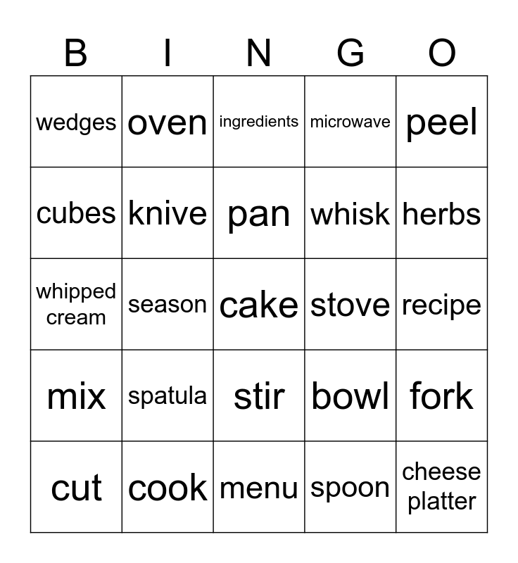 This bingo card has a free space and 24 words: spatula, cook, pan, cut, peel, wedges, cubes, oven, stove, stir, whisk, whipped cream, bowl, fork, knive, spoon, recipe, ingredients, herbs, season, cheese platter, mix, microwave and menu.