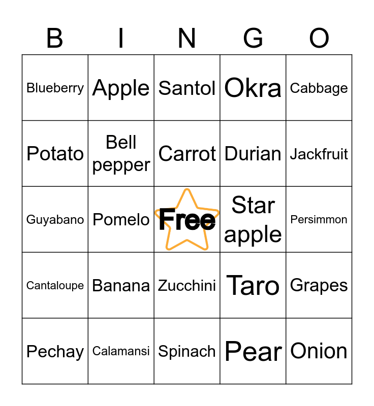 This bingo card has a free space and 79 words: Turnip, Kangkong, Santol, Coconut, Papaya, Chayote, Celery, Bitter gourd, Tomato, Guava, Sineguelas, Avocado, Okra, Blueberry, Durian, Potato, Passion fruit, Banana, Leeks, Persimmon, Garlic, Cabbage, Guyabano, Carrot, Bell pepper, Mango, Malunggay, Cucumber, Pineapple, Cauliflower, Jackfruit, Tamarind, Spinach, Plum, Pechay, Star apple, Upo, Mustasa, Chili pepper, Onion, Strawberry, Watermelon, Corn, Lychee, Pine nut, Apple, Dragon fruit, Ginger, Orange, Rambutan, Grapes, Pomelo, Taro, Squash, Radish, Sweet potato, Bok choy, Lime, Eggplant, Zucchini, Durian, Honeydew, Beetroot, Mangosteen, Lemon, Peas, Broccoli, Green beans, String bean, Cantaloupe, Calamansi, Asparagus, Lettuce, Melon, Cherry, Pear, Peach, Mustasa and Spinach.