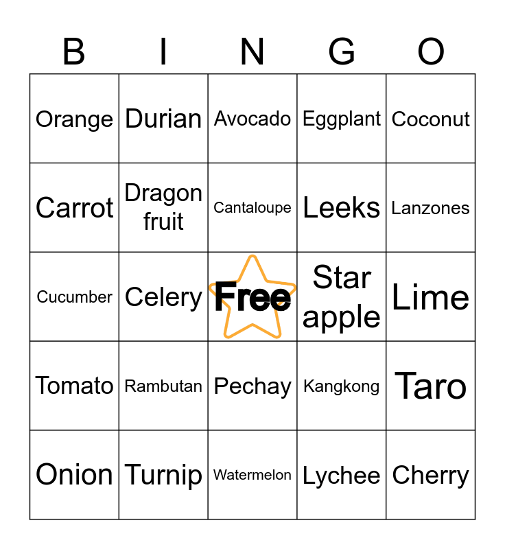 This bingo card has a free space and 75 words: Apple, Asparagus, Avocado, Banana, Beetroot, Bell pepper, Bitter gourd, Blueberry, Bok choy, Broccoli, Cabbage, Calamansi, Cantaloupe, Carrot, Cauliflower, Celery, Chayote, Cherry, Chili pepper, Coconut, Corn, Cucumber, Dragon fruit, Durian, Eggplant, Garlic, Ginger, Grapes, Green beans, Guava, Guyabano, Honeydew, Jackfruit, Kangkong, Lanzones, Leeks, Lemon, Lettuce, Lime, Lychee, Malunggay, Mango, Mangosteen, Melon, Mustasa, Okra, Onion, Orange, Papaya, Passion fruit, Peach, Pechay, Pear, Persimmon, Pine nut, Pineapple, Plum, Pomelo, Potato, Radish, Rambutan, Santol, Sineguelas, Spinach, Squash, Star apple, Strawberry, Sweet potato, Tamarind, Taro, Tomato, Turnip, Upo, Watermelon and Zucchini.