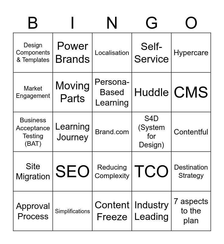 This bingo card has 25 words: SEO, Content Freeze, Persona-Based Learning, Approval Process, Hypercare, Design Components & Templates, Market Engagement, Power Brands, S4D (System for Design), Reducing Complexity, Huddle, Business Acceptance Testing (BAT), TCO, Destination Strategy, Moving Parts, 7 aspects to the plan, Contentful, Localisation, CMS, Learning Journey, Brand.com, Simplifications, Site Migration, Self-Service and Industry Leading.