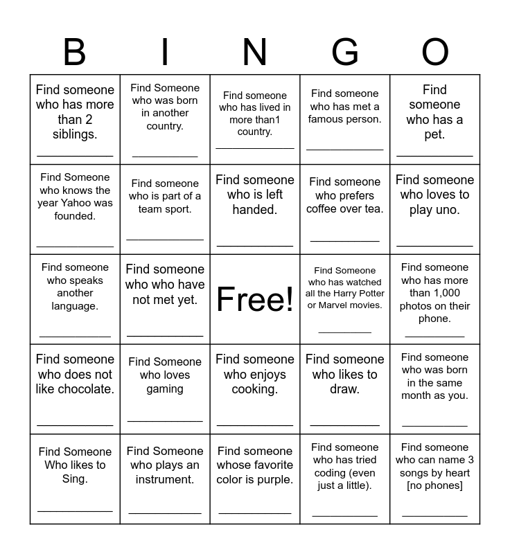 This bingo card has a free space and 24 words: Find Someone who loves gaming ____________, Find Someone who plays an instrument. ___________, Find someone who is left handed. ___________, Find Someone Who likes to Sing. ____________, Find someone who has a pet. ___________, Find someone who has more than 2 siblings. ___________, Find Someone who knows the year Yahoo was founded. _____________, Find Someone who was born in another country. ___________, Find Someone who has watched all the Harry Potter or Marvel movies. __________, Find someone who enjoys cooking. ___________, Find someone who prefers coffee over tea. ___________, Find someone who speaks another language. ____________, Find someone who likes to draw. __________, Find someone who was born in the same month as you. ___________, Find someone who is part of a team sport. _____________, Find someone who has tried coding (even just a little). ___________, Find someone who has more than 1,000 photos on their phone. __________, Find someone who has lived in more than1 country. ______________, Find someone who loves to play uno. ___________, Find someone who who have not met yet. ___________, Find someone who can name 3 songs by heart [no phones] ___________, Find someone who does not like chocolate. ___________, Find someone who has met a famous person. _____________ and Find someone whose favorite color is purple. ___________.