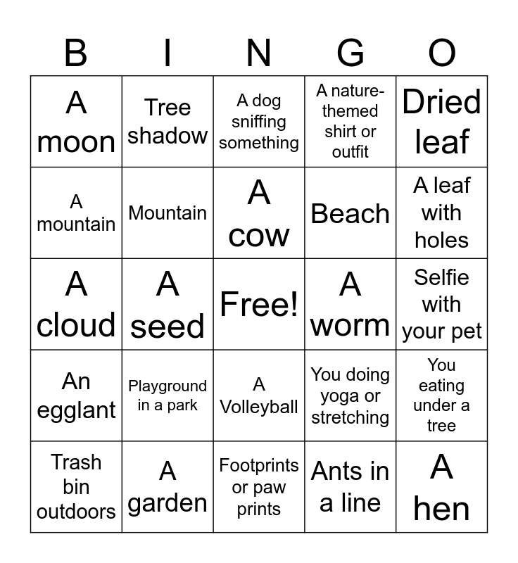 This bingo card has a free space and 24 words: Playground in a park, A garden, A cow, Trash bin outdoors, Dried leaf, A moon, A mountain, Tree shadow, A worm, A Volleyball, Beach, A cloud, You doing yoga or stretching, You eating under a tree, Mountain, Ants in a line, Selfie with your pet, A dog sniffing something, A leaf with holes, A seed, A hen, An egglant, A nature-themed shirt or outfit and Footprints or paw prints.