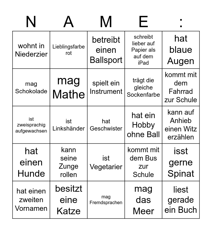 This bingo card has 25 words: hat einen Hunde, besitzt eine Katze, hat Geschwister, mag das Meer, hat blaue Augen, wohnt in Niederzier, Lieblingsfarbe rot, betreibt einen Ballsport, hat ein Hobby ohne Ball, isst gerne Spinat, mag Schokolade, mag Mathe, mag Fremdsprachen, kommt mit dem Bus zur Schule, kommt mit dem Fahrrad zur Schule, hat einen zweiten Vornamen, ist Linkshänder, spielt ein Instrument, trägt die gleiche Sockenfarbe, kann auf Anhieb einen Witz erzählen, ist zweisprachig aufgewachsen, kann seine Zunge rollen, ist Vegetarier, schreibt lieber auf Papier als auf dem iPad and liest gerade ein Buch.