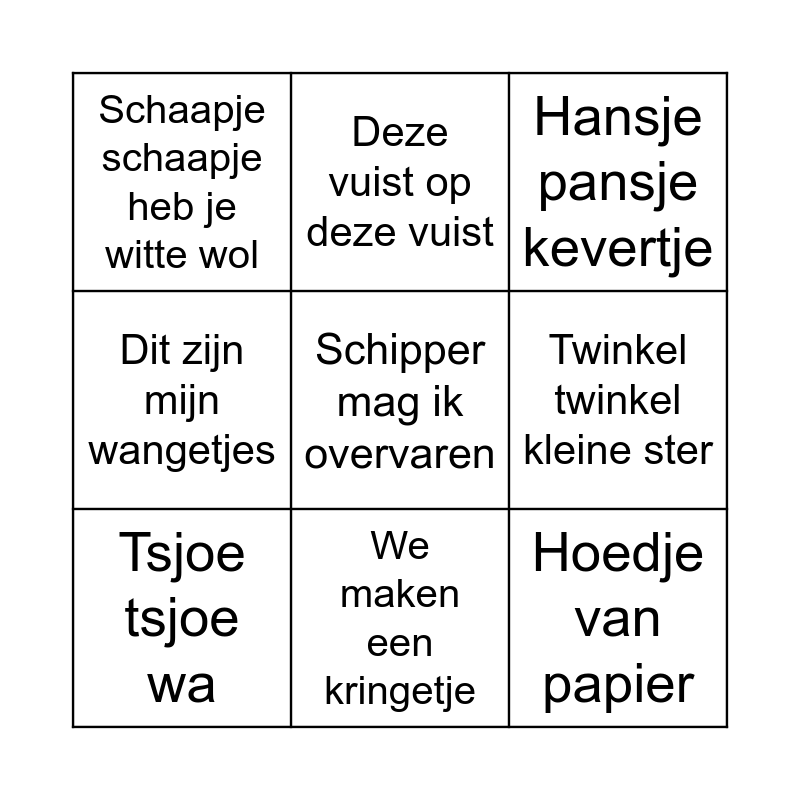 This bingo card has 17 words: Olifantje in het bos, Alle eendjes zwemmen in het water, Hansje pansje kevertje, Schaapje schaapje heb je witte wol, Berend botje, Dit zijn mijn wangetjes, Humpty dumpty, Tsjoe tsjoe wa, We maken een kringetje, Twinkel twinkel kleine ster, In Holland staat een huis, Hop paardje hop, Schipper mag ik overvaren, Deze vuist op deze vuist, Hoedje van papier, De krokodil and Het alfabetlied.