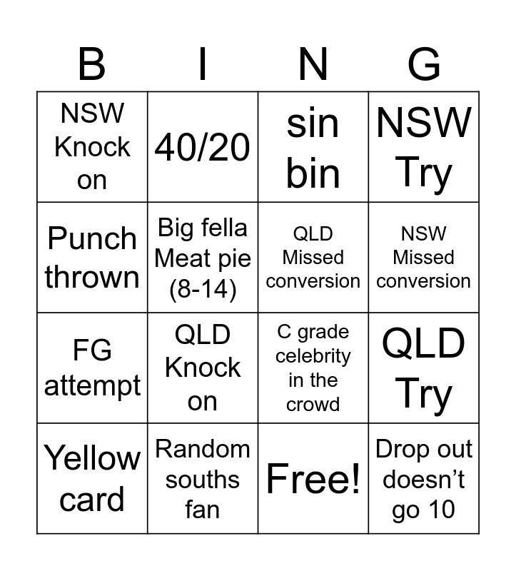 This bingo card has 17 words: Free!, Yellow card, sin bin, NSW Knock on, QLD Knock on, NSW Try, QLD Try, QLD Missed conversion, NSW Missed conversion, Big fella Meat pie (8-14), Random souths fan, C grade celebrity in the crowd, Punch thrown, 40/20, FG attempt, Kick out on the full and Drop out doesn’t go 10.