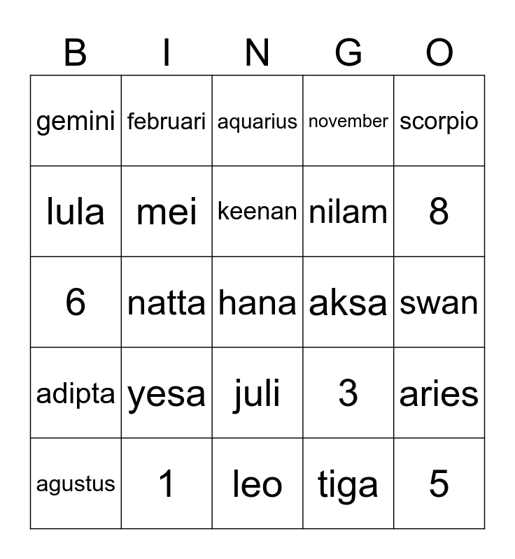 This bingo card has a free space and 24 words: yesa, 1, keenan, agustus, scorpio, gemini, lula, februari, aksa, juli, nilam, 6, 3, aries, mei, tiga, swan, aquarius, 8, natta, 5, adipta, november and leo.