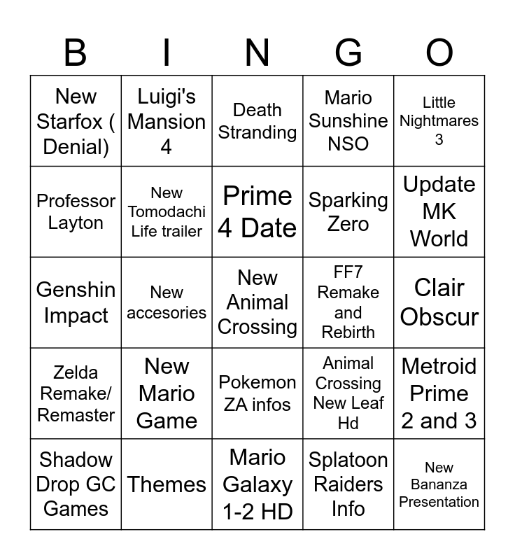 This bingo card has a free space and 24 words: New Mario Game, Themes, Prime 4 Date, Shadow Drop GC Games, Little Nightmares 3, New Starfox ( Denial), Professor Layton, Luigi's Mansion 4, FF7 Remake and Rebirth, Pokemon ZA infos, Sparking Zero, Genshin Impact, Animal Crossing New Leaf Hd, Metroid Prime 2 and 3, New Tomodachi Life trailer, Splatoon Raiders Info, Clair Obscur, Death Stranding, Update MK World, New accesories, New Bananza Presentation, Zelda Remake/ Remaster, Mario Sunshine NSO and Mario Galaxy 1-2 HD.