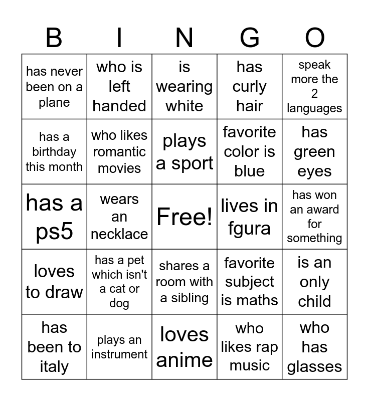 This bingo card has a free space and 24 words: has a pet which isn't a cat or dog, plays an instrument, plays a sport, has been to italy, speak more the 2 languages, has never been on a plane, has a birthday this month, who is left handed, lives in fgura, shares a room with a sibling, favorite color is blue, has a ps5, favorite subject is maths, is an only child, who likes romantic movies, who likes rap music, has won an award for something, is wearing white, has green eyes, wears an necklace, who has glasses, loves to draw, has curly hair and loves anime.