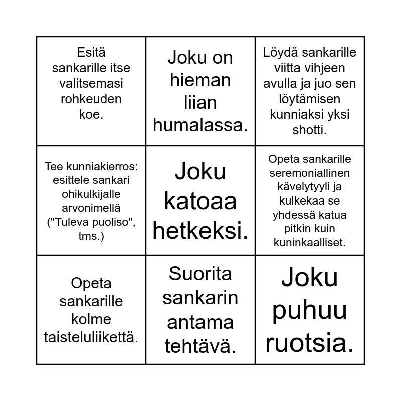 This bingo card has 9 words: Opeta sankarille kolme taisteluliikettä., Löydä sankarille viitta vihjeen avulla ja juo sen löytämisen kunniaksi yksi shotti., Joku on hieman liian humalassa., Tee kunniakierros: esittele sankari ohikulkijalle arvonimellä ("Tuleva puoliso", tms.), Esitä sankarille itse valitsemasi rohkeuden koe., Opeta sankarille seremoniallinen kävelytyyli ja kulkekaa se yhdessä katua pitkin kuin kuninkaalliset., Joku katoaa hetkeksi., Joku puhuu ruotsia. and Suorita sankarin antama tehtävä..