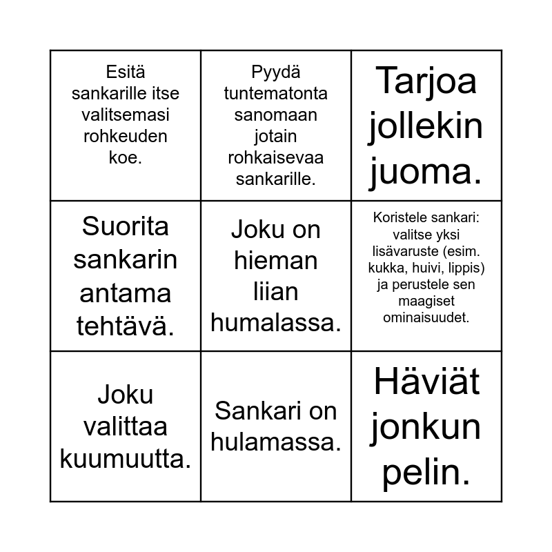 This bingo card has 9 words: Joku valittaa kuumuutta., Tarjoa jollekin juoma., Pyydä tuntematonta sanomaan jotain rohkaisevaa sankarille., Suorita sankarin antama tehtävä., Esitä sankarille itse valitsemasi rohkeuden koe., Koristele sankari: valitse yksi lisävaruste (esim. kukka, huivi, lippis) ja perustele sen maagiset ominaisuudet., Joku on hieman liian humalassa., Häviät jonkun pelin. and Sankari on hulamassa..