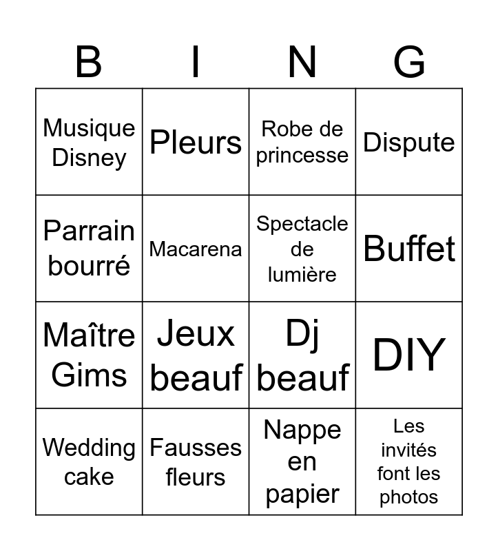 This bingo card has 16 words: Fausses fleurs, DIY, Robe de princesse, Musique Disney, Maître Gims, Pleurs, Dj beauf, Nappe en papier, Parrain bourré, Macarena, Wedding cake, Dispute, Jeux beauf, Buffet, Spectacle de lumière and Les invités font les photos.