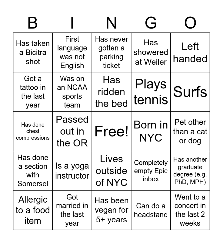 This bingo card has a free space and 36 words: Has run a marathon, Appeared in a movie or TV show, Speaks 3 or more languages, Was on an NCAA sports team, Completely empty Epic inbox, Has done a section with Somersel, Has ridden the bed, Doesn't drink coffee, Left handed, Lived outside the US, Passed out in the OR, Has showered at Weiler, Has climbed a mountain, Born in NYC, Surfs, Has taken a Bicitra shot, Has gotten IV fluids in triage, Is a yoga instructor, Went to a concert in the last 2 weeks, Has never gotten a parking ticket, Pet other than a cat or dog, Has another graduate degree (e.g. PhD, MPH), Got married in the last year, Allergic to a food item, Has been vegan for 5+ years, First language was not English, Has done chest compressions, Has followed a resident to the bathroom, Plays tennis, Got a tattoo in the last year, Has mistakenly called a patient fully dilated, Had a career before medicine, Can do a headstand, Lives outside of NYC, Read a book for fun this week and Doesn't have a car.