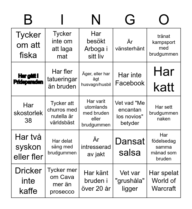 This bingo card has 25 words: Har delat säng med brudgummen, Har känt bruden i över 20 år, Äger, eller har ägt husvagn/husbil, Dricker inte kaffe, tränat kampsport med brudgummen, Tycker om att fiska, Har gått i Prideparaden, Tycker inte om att laga mat, Vet vad "Me encantan los novios" betyder, Är intresserad av jakt, Har inte Facebook, Har skostorlek 38, Dansat salsa, Har födelsedag samma månad som bruden, Har fler tatueringar än bruden, Har spelat World of Warcraft, Har sett brudgummen naken, Har besökt Arboga i sitt liv, Har katt, Tycker att churros med nutella är världsbäst, Har varit utomlands med bruden eller brudgummen, Tycker mer om Cava mer än prosecco, Har två syskon eller fler, Är vänsterhänt and Vet var "grushåla" ligger.