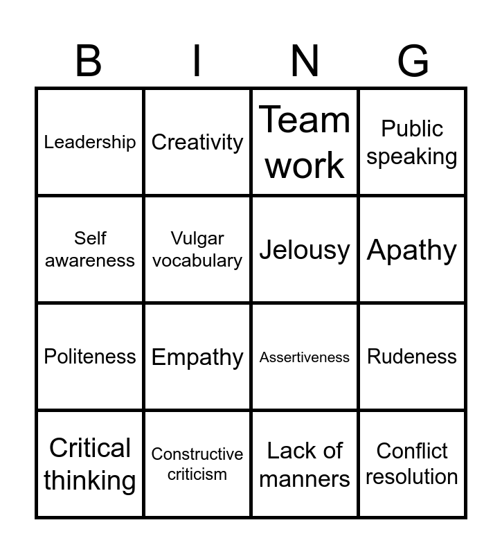This bingo card has 18 words: Empathy, Conflict resolution, Team work, Leadership, Assertiveness, Public speaking, Critical thinking, Creativity, Apathy, Politeness, Lack of manners, Self awareness, Rudeness, Vulgar vocabulary, Jelousy, Kindness, Constructive criticism and Honesty.